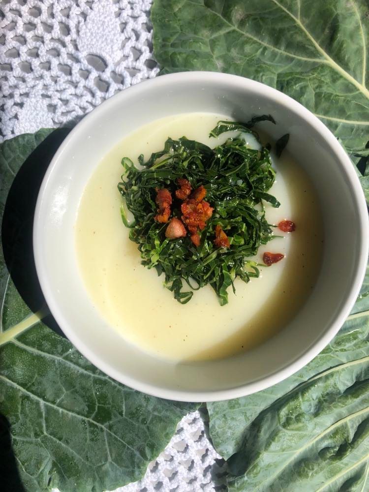 Após a cozedura reduza aas batatas, a cebola e os dentes de alho a puré. Juntar a couve cortada e deixar cerca de 15 minutos.
