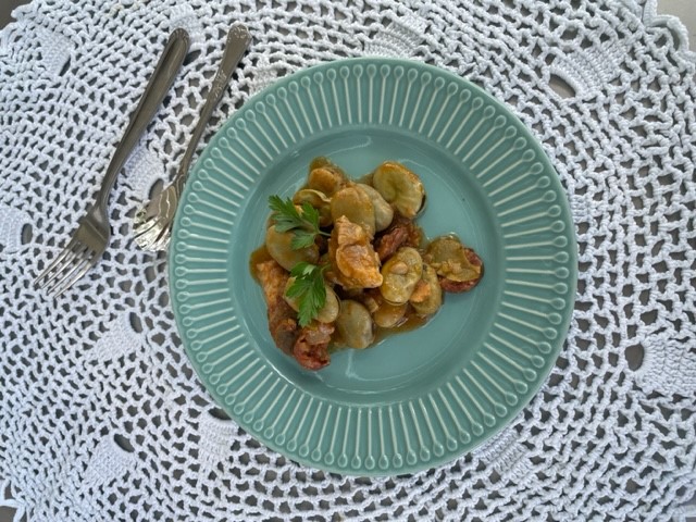 Retirar o entrecosto e colocar as favas descascadas durante 10 minutos, com o entrecosto no topo do preparado.