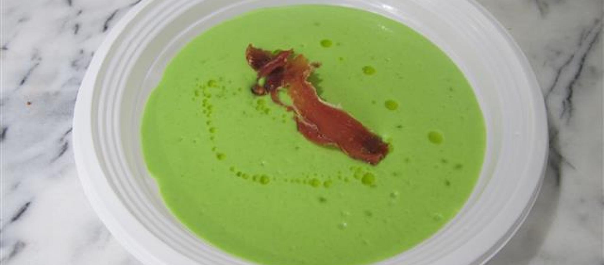 Bringir as ervilhas em agua quente durante 3minutos e colocar em agua e gelo, de seguida levar a bimby e juntar um pouco da agua da cozedura anterior e juntar manteiga ate ficar com uma textura cremosa, retificar temperos e servir, polvilhar com cebolinho fresco picado e crocante de presunto desidratado no forno a 160ºc durante 8 minutos..